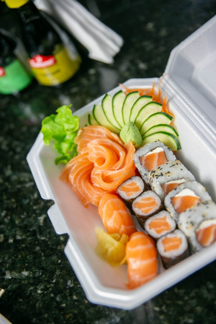 03 Joes de Salmão,03 Joes Crocante, 04 Uramakis de Salmão e 06 Sashimis de Salmão.