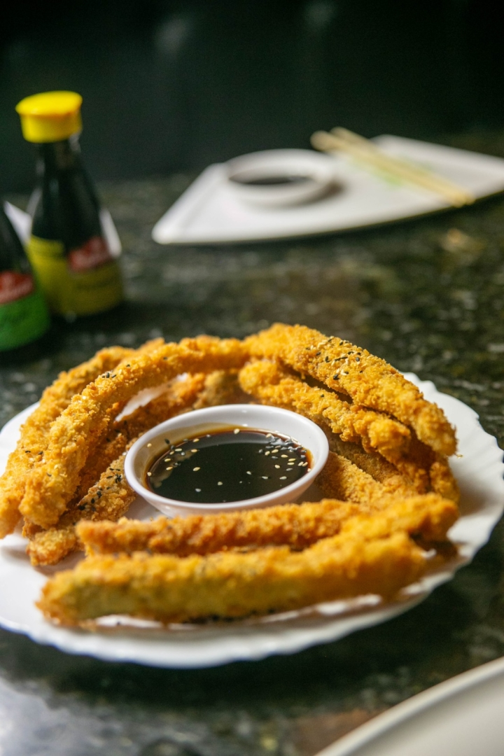 150 Gr de Pele de Salmão em Tiras Temperadas, Empanada e Frita, Acompanha Tarê da Casa.